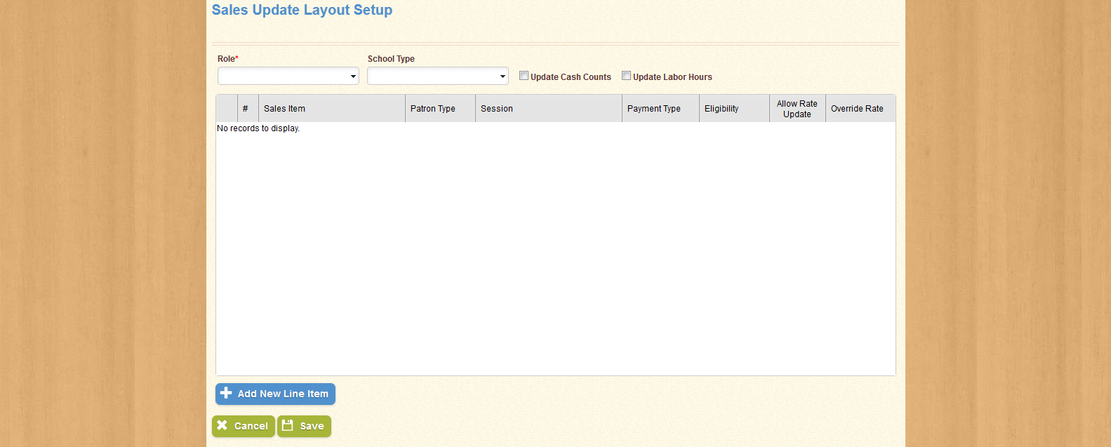 Select a Role and a School Type from the drop-down menus provided, and use the check-boxes provided to select whether the selected Sales Update Layout will also allow the user to update Cash Counts and Labor Hours.