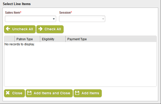 Select a Sales Item from the drop-down menu provided, and select a Session type when the Session drop-down menu becomes active. When you select a Session type, the list will become populated with Line Items, as shown below: