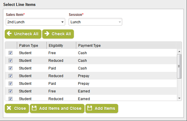 Use the Uncheck All or Check All buttons to select all or none of the Line Items in the list, or use the check-boxes in the first column of each row to select the item in that row.