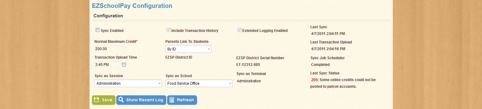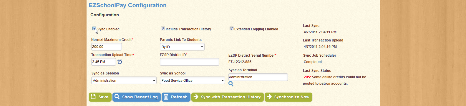 Note that all the fields are now active. You can set a Normal Maximum Credit, Transaction Upload Time, Parents' Link to Students, Sync Session, Sync School, and Sync Terminal. You can now also enter your District ID as it appears on your EZSchoolPay account.