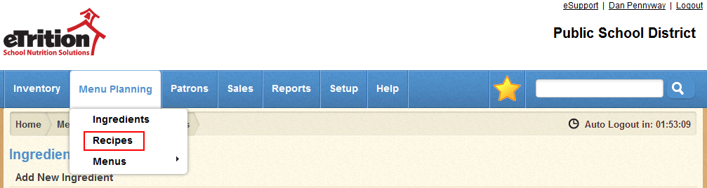 Before you can add a recipe to a menu, you must first create the recipe within your system. Be sure to use the Yield Factor Method when determining the amounts for each ingredient used in the recipe. Follow these steps to create a recipe: