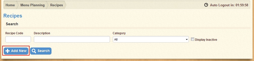 - Fill in the Recipe Code, Description, Menu Description, Servings, and Serving Size fields for the new recipe. Select a recipe category from the Category drop-down menu.