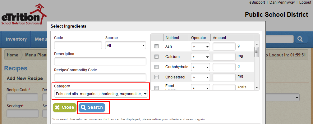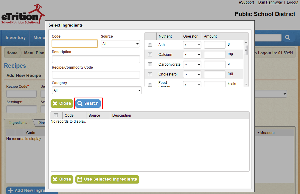 - In the pop-up window that appears, use the search form to locate the desired ingredient, and click "Search".