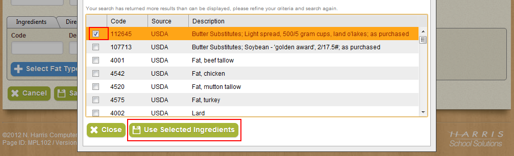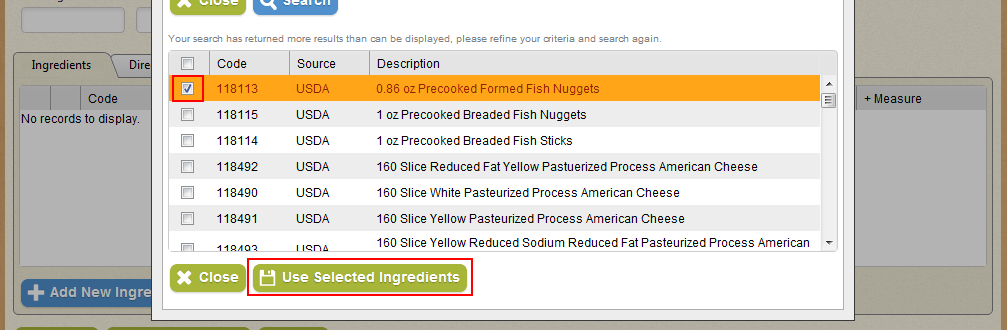 - Use the check-box in the left-hand column to select the desired ingredient or ingredients, and click "Use Selected Ingredients" to add the selected ingredient to the table.