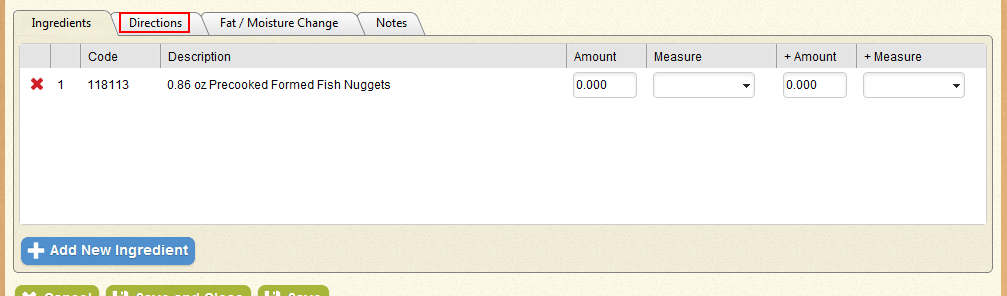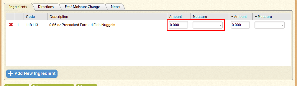 - Enter the desired Amount in the Amount column and select the desired Measure to designate the amount of the selected ingredient that is included in the recipe.