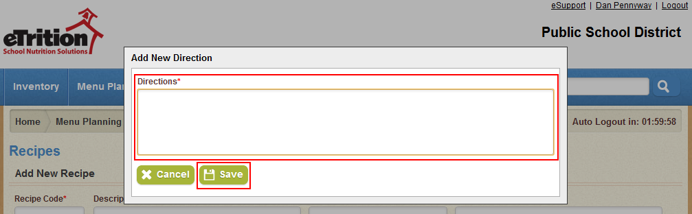- Enter the instructions for the new direction, and click Save. Repeat as needed for each instruction in the recipe.