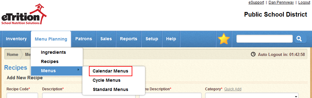 Once you have created one or more recipes, you can create calendar menus, which are used for scheduling production and serving of meals. Follow these steps to create a new calendar menu: