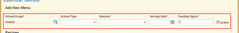 - Fill in the Serving Date and Feeding Figure fields. Select a School Type and Session from the drop-down menus provided. Select a School Group using the magnifying glass icon.
