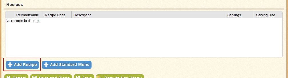 - In the recipes table, click "Add Recipe" to add a new recipe to the table.
