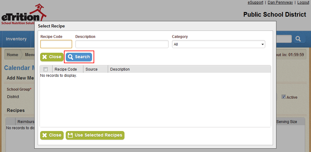 - In the pop-up window that appears, use the search fields to locate the desired recipe, and click "Search".