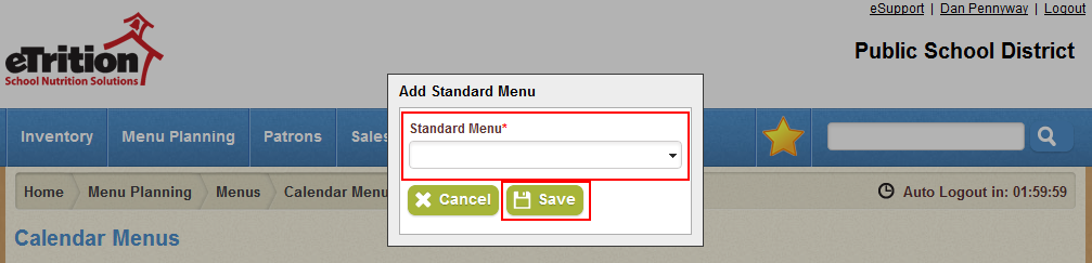 - In the pop-up window that appears, select the desired standard menu from the drop-down menu provided. Click "Save" to add that menu's recipes to the list.