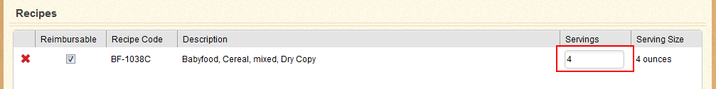 - Enter the number of servings for each recipe in the Servings column.